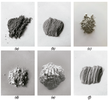 Figure 2: Materials used in this research: (a) Cement HE; (b) condensed silica fume; (c) EASF; (d) micro limestone powder; (e) recycled glass powder; and (f) silica sand.