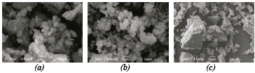 Figure 3: FSEM od supplementary cementitious materials used in research: (a) EASF; (b) Limestone powder; and (c) RGP.