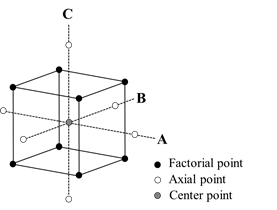 A central composite design is the most commonly used response surface designed experiment. Central composite designs are a factorial or fractional factorial design with center points, augmented with a group of axial points (also called star points) which increase the variable space and allow for the estimation of the second-order terms. The design used in this work involves 2N factorial points (which are in the corners of cube), 2N axial points at a distance ± α from the origin and 4 central point, as depicted in Fig. 4. Hence, a total of 18 set point, 4 center points (2 Axial plus 2 Cube), 2 blocks (Cube and Axial) and α =± 1.78885, was used in this research.