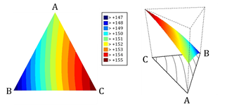 Fig. 7 shows the contour and 3D plot of the effect of factors A, B, and C on the 7-days compressive strength. The maximum value of 7-day compressive strength could be seen when factor A value is at its maximum level (1) and factor C is at a minimum level (-1). As for 1-day compressive strength, according to ANOVA results, presented in Table 6, a nonlinear relationship was obtained between the 7-day compressive strength and the three factors studied.