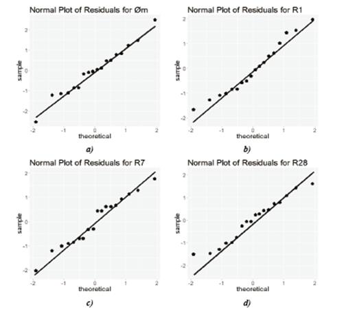 Figure 9: Normal Plot of residuals for each response’s model: a) Øm; b) R1; c) R7; and d) R28.