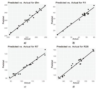 Figure 10: Predicted versus Actual values for each response’s model: a) Øm; b) R1; c) R7; and d) R28.
