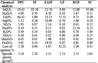 The RPC mixtures were prepared with raw materials locally available in Colombia. ASM Type HE cement (C) was used. The HE cement had a specific gravity of 3.15, and mean particle diameter (d 50 ) of 8 μm. The SF used in the mixture proportioning complied with ASTM C-1240 specifications and had a specific gravity of 2.20 and d 50 of 0.15 μm. The RPC was also designed with a SS of a specific gravity of 2.65, maximum particle size (d max ) of 600 μm, and d 50 of 165 μm. RGP with a specific gravity of 2.55 and d 50 of 28 μm was used, LP with a specific gravity of 2.73 and d 50 of 2 μm, and EASF with a specific gravity of 3.15 and d 50 of 2.1 μm were used as supplementary cementitious materials. EASF and RGP with the particle size distribution (PSD) depicted in Fig. 1 were obtained by grounding locally available raw waste materials with a jet mill to different degrees of fineness, by applying different grinding speeds. Table 1 shows the chemical composition of the materials used in this study. Fig. 1 provides the particle size distribution (PSD) of the cement, SF, LP, EASF, RGP and SS. Fig. 2 shows a photograph of the raw materials used in the research. A polycarboxylate (PCE)-based superplasticizer with a specific gravity of 1.07 and solid content of 40% was used.