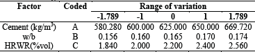 In this work, three independent factors, namely, cement content in kg/m3, water binder ratio (w/b), and volume of superplasticizer to total dosage ratio (PCE), were chosen. To determine the proportion of the rest of the concrete components, the A&A mod curve was used. Four responses were also considered, including compressive strength with standard curing conditions at 24 hours (R1), 7 days (R7), 28 days (R28), and spread flow (Ø m ).