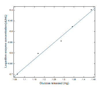 Figure 3: Logarithmic scale enzyme concentration with respect to milligrams of glucose released.
