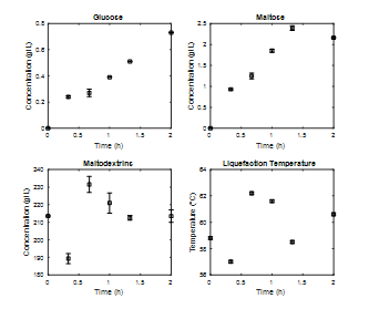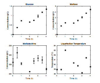 In Figs. 4 and 6 there are differences in the liquefaction stage with respect to the concentrations of components. This behavior is associated with the low concentrations of glucose and maltose generated. The concentration of maltodextrins was similar in both cases and present variations in the kinetics of this stage.