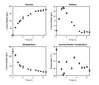 After this, the enzymatic hydrolysis process was repeated with an E/S ratio of 0.036% w/w in the liquefaction stage and 0.18% w/w in the saccharification stage. Again, Fig. 6 shows how in the liquefaction stage maltodextrins have high concentrations from the beginning of the process and deviations in some of their values, which are associated with difficulty in the quantification methodology. As mentioned earlier, there is no significant increase in the concentration of glucose and maltose, so the process is reduced to two hours. Again, it is observed how the process temperature seeks to stabilize for values close to 60°C.