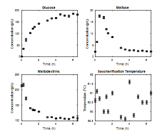 An analysis of the kinetics of maltodextrin consumption and glucose and maltose production was carried out for four hours in the liquefaction stage (Fig. 4), working with a substrate enzyme ratio of 0.036% w/w. The temperature variation is also shown throughout the stage.