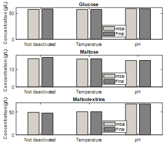 The efficacy of enzymatic deactivation pretreatments with temperature and pH on the enzymes used was analyzed, determining that for the latter the initial concentrations of glucose, maltose, and maltodextrins were on average 57.52, 15.89, and 50.65 g/L, and at the final time of six hours were 57.65, 16.04, and 50.74 g/L, respectively. This led to the selection of the pH deactivation method, given its ease of application with respect to temperature.