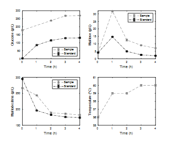 The concentrations of glucose, maltose, and maltodextrins for the sample and standard are presented in Fig. 9, as well as the process temperature. When analyzing the maltodextrins and maltose, it can be observed that in both cases similar concentrations are reached at the end of hydrolysis for both the sample and standard, although they are slightly higher in the sample. This guarantees that the inhibitory effect of glucose on the process was minimal and that its presence in high concentrations changed only the rate of consumption of maltodextrins and the rates of production and consumption of maltose in the first two hours of saccharification. Finally, however, the dynamics of both tests reach similar stationary values.