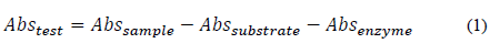 Here, Abs testis the real absorbance of the sample, Abs sample is the absorbance read on the spectrophotometer, Abs substrate is the absorbance of the control of the substrate used, and Abs enzyme is the absorbance of the enzymatic solution used.