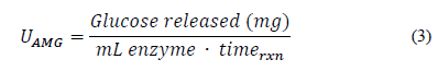 Here, U AMG is the enzymatic activity of amyloglucosidase, “Glucose released” is the amount of glucose quantified by HPLC after enzymatic hydrolysis, i mL enzyme is the amount of enzyme used in the assay, and time rxn is the time at which enzymatic hydrolysis occurs.