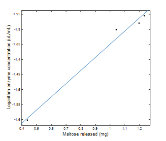 Figure 2: Logarithmic scale enzyme concentration with respect to milligrams of maltose released.
