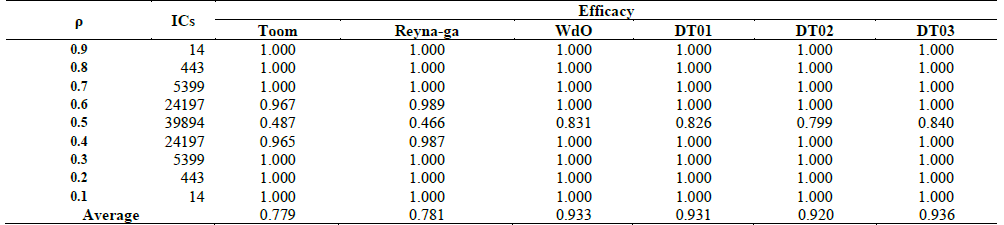 We assessed the quality of our models on the testing dataset of 100,000 ICs, and the results are compared with those of Toom’s and Reynaga’s models. In Table 2 we show the efficacies of Toom, Reynaga, WdO and our three models. For each density bin with 0.4 ≤ ρ and ρ ≥ 0.6 the classification is almost perfect. From this fact we can note that for comparisons we just need to consider ICs with ρ close to 0.5 and that the other bins that are in Table 2 can be considered trivial because even simpler models as Toom and Reynaga achieve the best efficacy. DT01 exceeds benchmark models in the average accuracy, being the performance for the three models similar for ρ values over 0.6 and below 0.4. The remarkable difference is observed for the bin of ρ around 0.5, where Toom and Reynaga models show and efficacy close to a random classification. WdO and our three models' performance are similar to the one reported in for WdO [12]. DT03 shows efficacy of 0.84 vs. 0.831 of WdO, maybe someone can conclude that DT03 is the best model, but we believe just a test on a dataset is insufficient to draw conclusions. In the following section we are going to carry on more tests and draw conclusions based on statistical tests.