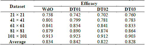 In this test, we can note divergence from results in Table 2, where DT03 achieved the best efficacy, but in Table 2, we can see that it is the best just for the dataset of 21 × 21 lattices.