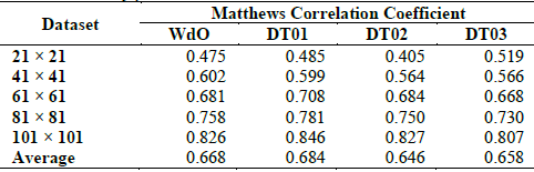 Table 4: Matthews Correlation Coefficient for WdO, DT01, DT02, and DT03 around the critical density ρ=0.5.