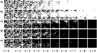 Figure 5: DT01 application examples on different ICs. Black cells represent estate ‘1’, and white cells state ‘0’. Transitions are shown from left to right. a) ρ0 = 0.43; b) ρ0 = 0.45; c) ρ0 = 0.53; d) ρ0 = 0.54; e) ρ0 = 0.54.