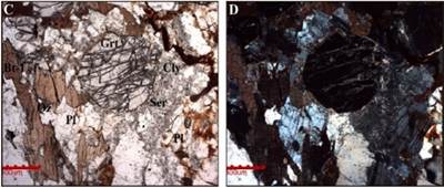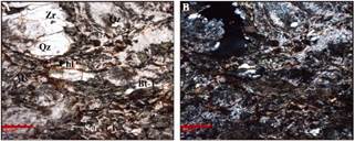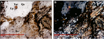 Figure 1: Biotite (Bt), epidote (Ep), quartz (Qz), sericite (Ser) and Tourmaline (Tur). A) NII - B) NX.
