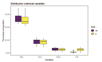 Figure 4: Chemical composition in oxides for raw (cr-yellow) and calcined (cal-purple) state clays with high silicon oxide content.