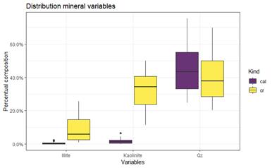 Figure 5: Composition of principal minerals for the evaluated raw (cr-yellow) and calcined clays (cal-purple).