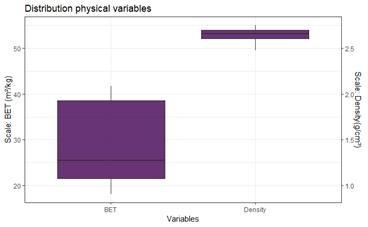 Figure 6: Density and Specific surface area (BET) for calcined clays with high silicon oxide content.