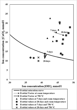 The test obtained two vectors which are shown in Fig. 8, and each implicitly retains a relationship with the calcination temperature. The vector obtained under natural conditions, that is, at room temperature, is above the Frattini saturation curve, from which it can be concluded that raw gneissic clay cannot be categorized as pozzolan under these conditions. However, when the other vector is studied, it can be seen that the consumption of [CaO] and [OH-] tends to increase considerably, causing the vector to appear below the saturation curve, thus the vectors resulting from 750 °C conditions show that thermally activated gneissic clay can be determined to be pozzolan.