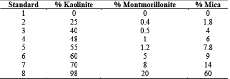 For the X-ray fluorescence studies, fused Pearl in Malvern Panalytical’s Axios FAST was used. Diffraction analysis was carried out in an aCubiX3 range XRD from Malvern Panalytical, with an X’celerator detector and an X-ray tube anode made of copper at 6-70° (° 2theta), a step size of 0.015 (° 2Theta) and a step time of 0.5 sec. For the mineralogical analysis and quantification, a calibration curve using pure minerals of quartz, mica and kaolinite according to the reflections in plane (00l ) was made in a mixture, and is shown in Table 1.