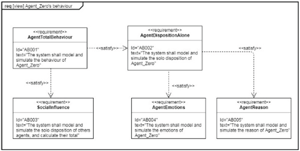 Fig. 2 shows the SysML diagram of requirements associated with the initial justification and the interpretation of the model. The main requirement consists of the M&S of the behaviour of Agent_Zero. This requirement must satisfy the social influence requirement and the disposition when alone requirement. The later requirement must satisfy the requirement corresponding to emotions and to reason.