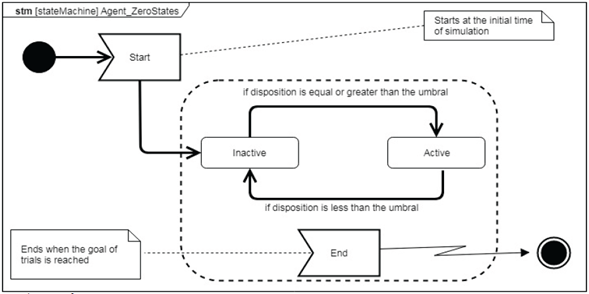 Fig.4 shows the SysML state machine diagram of Agent_Zero. It only has two states: active and inactive. If the disposition is equal or greater than the threshold of action, Agent_Zero passes from inactive to active, and remains in this state while this condition is fulfilled. If the disposition falls below the threshold of action, Agent_Zero returns to the inactive state. The state machine starts at the initial time of simulation, i.e., t=0 for this demonstrative example, and ends when the goal of external stimulus (trials) is reached, i.e., trial =50 for this demonstrative example.