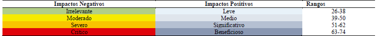 El resultado de esta sumatoria es la “Importancia del Impacto”, la cual a su vez se distingue como positiva o negativa y se jerarquiza en una serie de rangos específicos, los cuales están consignados en la Tabla 4.