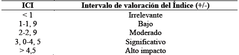 El Índice de Cuantificación de Impacto (ICI) se establece mediante la siguiente expresión, dónde, Sign: es igual a +1, si el impacto es positivo y -1, si el impacto es negativo. Nivel de impacto: se toman los valores 1, 2 ,3 y 4 según la clasificación por rangos utilizada en la Tabla 4, siendo para un impacto negativo, 1 irrelevante, 2 moderado, 3 severo y 4 crítico. Por otro lado, si el impacto es positivo el valor 1 es leve, 2 medio, 3 significativo y 4 beneficioso. La Magnitud e Importancia de impacto ambiental fueron definidas en la sección anterior.