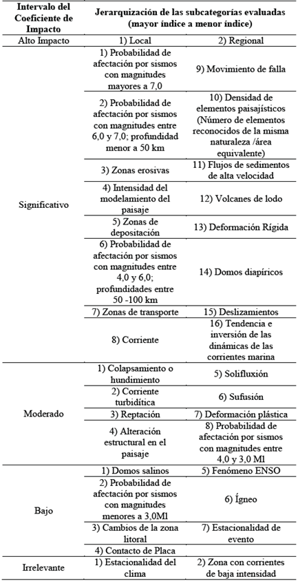El ICI también se implementó como una herramienta para la jerarquización de las diferentes acciones que impactan el territorio, resaltando las acciones con mayor peso en todos los factores de los diferentes componentes que hacen parte de los factores de la matriz. Con esta información extraída del ICI, se ha podido observar cuales son los grupos de acciones con mayores afectaciones en orden de importancia para el área de estudio, siendo la actividad sísmica (sismos mayores 7,0; sismos entre 6,0Ml y 7,0Ml; sismos entre 4,0 Ml y 6,0Ml), la dinámica Sedimentaria (zonas de transporte; zonas de depositación; zonas de erosión), la actividad tectónica (movimiento de falla; deformación rígida), las corrientes submarinas (corriente, tendencia e inversión de las dinámicas de las corrientes marinas), los fenómenos de remoción en masa (flujos de sedimentos de alta velocidad y deslizamientos), modelamiento de paisaje (intensidad y densidad de elementos paisajísticos) y las anomalías paisajísticas asociadas a formas cónicas y dómicas (volcanes de lodo y domos diapíricos), las más significativas.