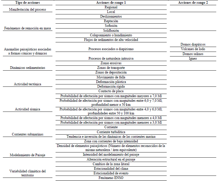 Así mismo, teniendo en cuenta la dinámica del área de estudio, se caracterizaron una serie de actividades o procesos naturales que se efectúan dentro del territorio o en sitios cercanos al mismo y que son consideradas como procesos de carácter geológico que se establecen dentro de la naturalidad de esta clase de ambientes y a los cuales se le ha denominado como acciones, que a su vez se encuentran divididas, en nueve tipos que pueden generar alteraciones en los diferentes componentes que hacen parte del territorio, ver Tabla 2. Por último, las acciones en la matriz de impactos se encuentran en la parte superior y de manera vertical con el fin de ver su relación con los diferentes factores del territorio.