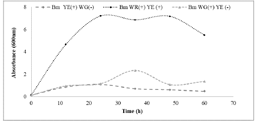 Figure S3: Growth curves of B. megaterium LVN01 strains in waste glycerol with and without yeast extract. Bm YE (+) WG (-): B. megaterium LVN01 culture in yeast extract without waste glycerol. Bm EL (+) WG (+): B. megaterium LVN01 culture in yeast extract with waste glycerol. Bm WG (+) YE (-): B. megaterium LVN01 culture in waste glycerol without yeast extract.