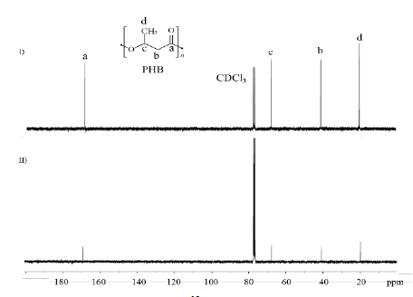 Figure S6: Spectrum 300 MHz 13C-NMR of (I) PHB commercial compared to (II) spectrum of PHB obtained from B. megaterium LVN01.