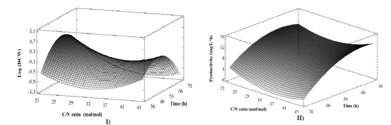 Figure 1: Fitted response surfaces for (I) DCW and (II) PHB productivity from the B. megaterium LVN01:residual glycerol system at 30 °C.