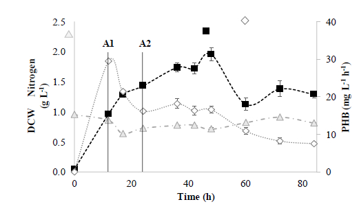 Figure 2: Fed-batch system in a 5 L bioreactor. ( ) PHB Productivity (mg L-1 h-1); ( ) ammonia nitrogen (g L-1); ( ) DCW (g L-1); A1 (12 h) and A2 (24 h) represent glycerol feed times.
