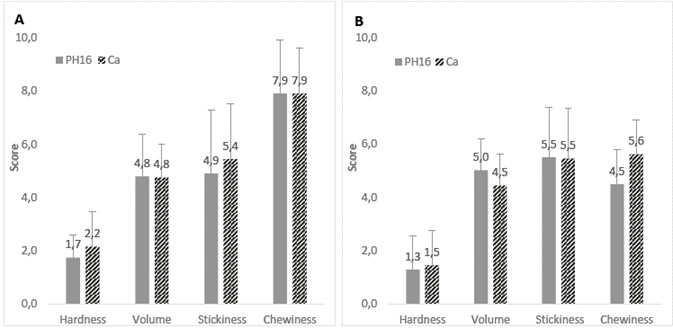 Storage stability or shelf life of baked goods could be defined as maintaining the sensory and physical characteristics associated with freshness, such as crumb softness, compressibility, and moisture by preventing the alteration associated with aging during storage [25]. Based on the results for height, moisture content, texture, color, and porosity in the physicochemical analysis of samples, the PH16 and Ca treatments were selected to perform the storage and sensory analysis. Fig. 2 showed the storage behavior of samples for the firmness (A) and moisture content (B) parameters. Both treatments presented similar behaviors for the two variables evaluated. While moisture content remained approximately constant, firmness tended to increase over time. This result coincides with those reported by other authors [13,20].