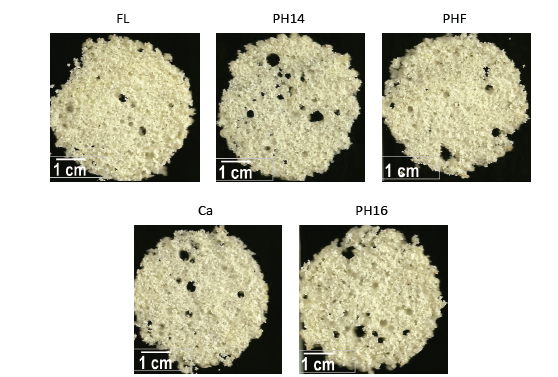 Fig. 1 depicted the scanned images of the different treatments and Table 6 showed the quantitative information obtained through the image analysis performed. In the images, a porous structure was seen as a product of the expansion of gas bubbles during the baking process. In the quantitative analysis, no significant differences were found between treatments in the total number of pores. Regarding the distribution of pores size, FL presented a higher percentage of small pores, while PH14 showed a higher percentage of large pores, as evidenced in the images.