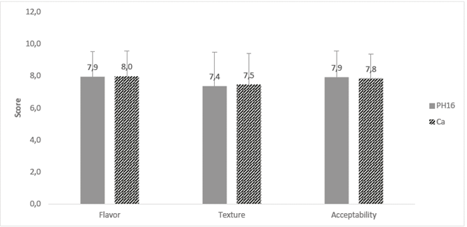 Fig. 3 showed the acceptability results for the two samples evaluated on day zero of storage. In general, consumer acceptance was high for both products. There were no significant differences in any of the three parameters evaluated for both samples. However, some consumers found the PH16 sample drier than the commercial sample.