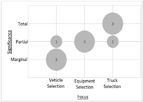 Fig. 2 shows that the intersection between the highest level of significance (total) and focus (truck selection) returns 3 articles. However, we found an article focusing on equipment selection with a medium level of significance, as trucks are considered transport equipment in industries.