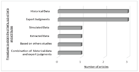 Criteria, sub-criteria and attributes are data of extremely importance for decision-making support methods. It is through them that the constraints and conditions of the mathematical models are elaborated. Having that in mind, the way they are selected is of utmost importance and they can be determined by historical data, expert judgments, based on others studies, extracted data, simulated data, as well as a combination of them. Thus, Fig. 5 shows the number of articles that used each of these procedures to obtain the criteria, sub-criteria and attributes needed to evaluate the alternatives.