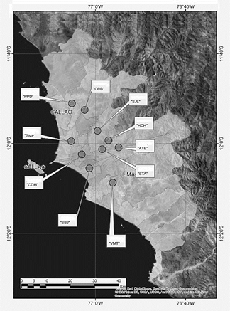 Fig. 1 shows the Lima and Callao monitoring network, which includes: San Juan de Lurigancho (SJL), San Borja (SBJ), Villa Maria del Triunfo (VMT), Jesús María (campo de marte, CDM), San Martín de Porres (SMP), Carabayllo (CRB) Puente Piedra (PPD), Huachipa (HCH) Santa Anita (STA), and Ate (ATE) districts.