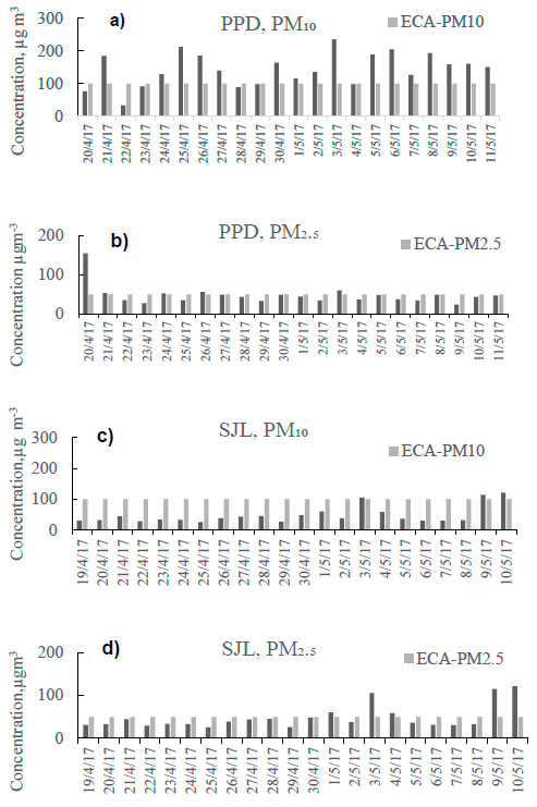 Figure 2: PM10 Concentrations in the PPD (a, b) and SJL (c, d) districts.