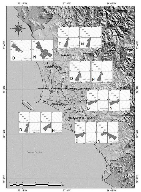 Fig. 3 shows some of the automatic stations belonging to the SENAMHI observational network as well as the wind roses based on two months of hourly wind data (April-May 2017). It may be observed that the predominant winds blow towards the north, the northeast and the east.