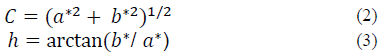L*: 0 = black and 100 = white; a*: -60 = green and +60 = red; b*: -60 = blue and +60 = yellow; h - tone: 90° = yellow, 180° = green and 0° = red; C* - chroma: distance from the coordinates at the origin to the determined color point All values are the means ± standard deviation of three repetitions. Source: The Authors.