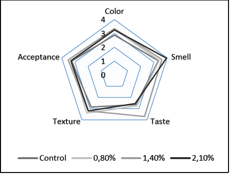 The qualitative characteristics of color, smell, taste, texture and acceptance established the sensory evaluation of the processed chorizos, which used pieces approximately 1.5 cm long, softened in neutral vegetable oil and labeled with random three-digit numbers for each of the evaluated samples. The samples were offered to 70 untrained evaluators between the ages of 21 and 60, of both sexes and from different social classes. Said evaluation was applied between 2:00 P.M. and 5:00 P.M. in order to minimize the possible effects caused by hunger or satiety. A survey was applied with a hedonic scale of seven points (1 = I like very much and 7 = I dislike it a lot), according to the methodology proposed by Duizer and Walker [37].