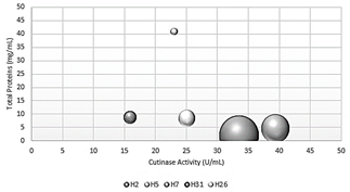 Fig. 4 shows the specific activity of crude extracts from the 5 species selected by the P-NPB method. The species Fusarium fujikuro and Penicillum chrysogenum had the highest specific activity with activity values of 16.8 U/mg and 8.6 U/mg, respectively. Trichoderma harzianum had the highest protein value of 40.9 mg/mL. This could be because the amount of protein obtained did not correspond to cutinases as in previous cases.