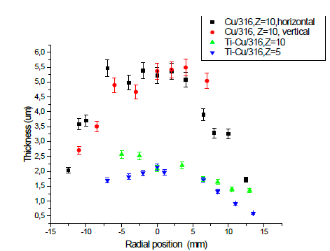 Figure 9: Profiles from thickness measurements taken with the Calotest for copper and titanium coatings at z = 10 cm, z= 5 cm.