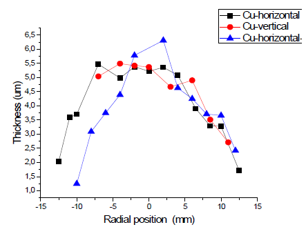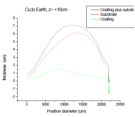The profiles measured with Calotest for Cu coatings in different samples are shown in Fig. 13. The samples were placed under the same conditions: floating, with the filter polarized at + 18V and at an azimuth distance z = + 10cm with the filter polarized at + 18V and at an azimuth distance z = + 10cm.